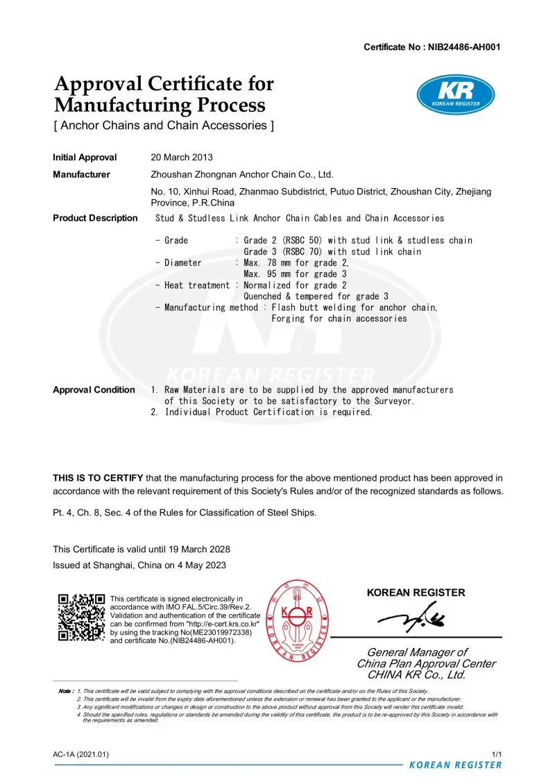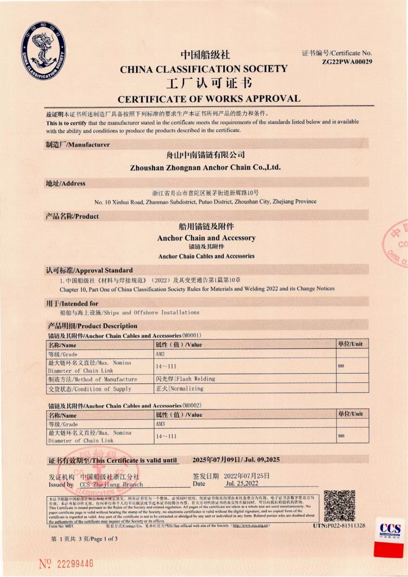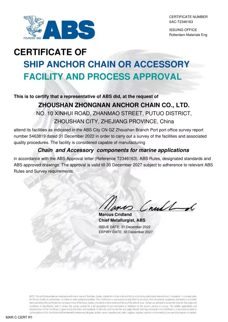 Taip. Visi mūsų inkarų grandinės priedai yra gaminami pagal tuos pačius tarptautinius standartus, kurie taikomi pačioms inkarų grandinėms (ISO, IAC), įskaitant CCS, ABS, DNV, LR, BV, NK, KR, Rina ir RS patvirtinimus. Šie sertifikatai užtikrina, kad aksesuarai atitiktų matmenų tikslumo, saugos ir mechaninio stiprumo reikalavimus, kuriuos nustato pasauliniai laivų statytojai ir jūrų operatoriai.