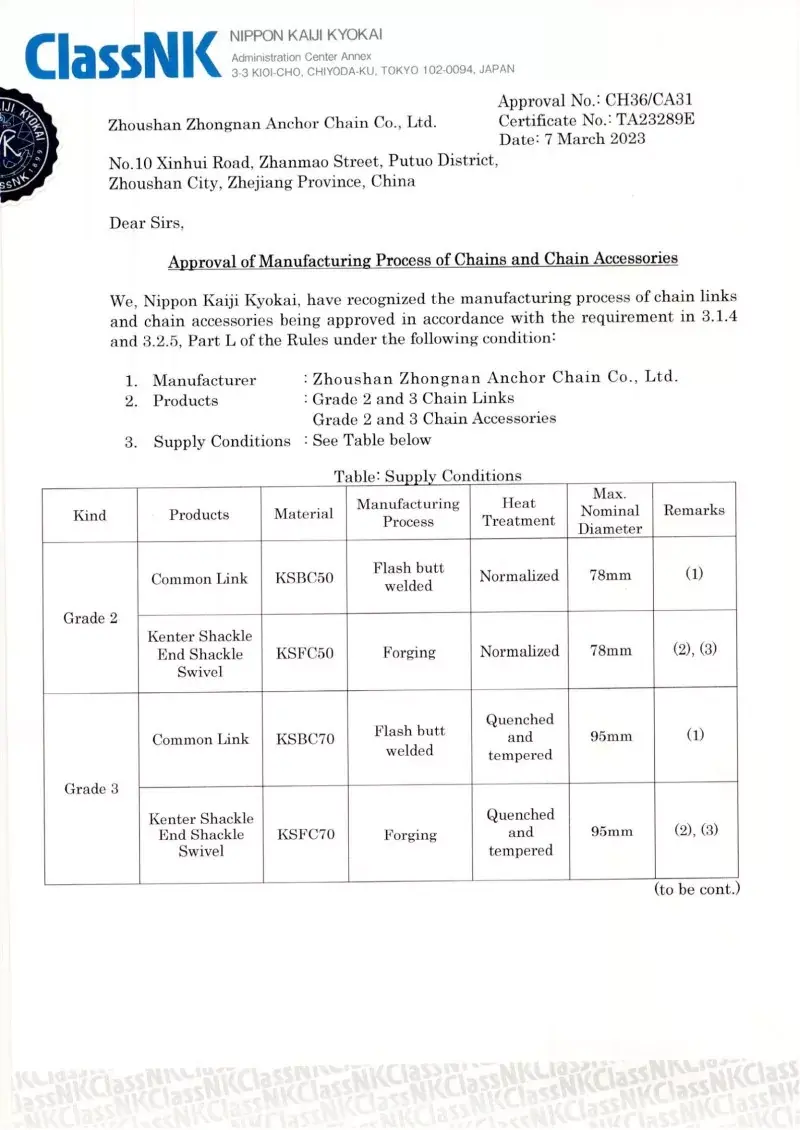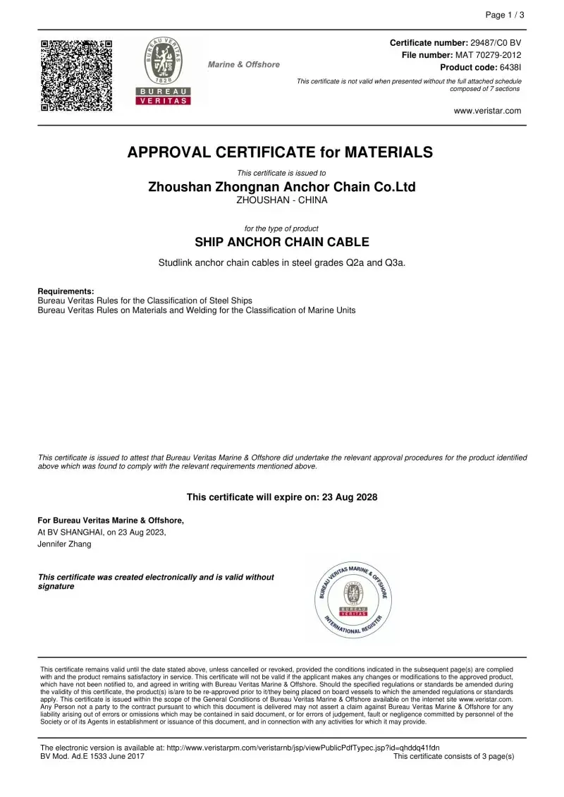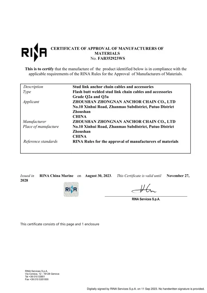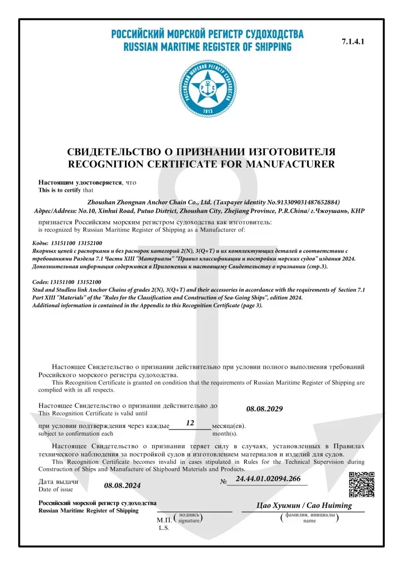 Taip. Visi mūsų inkarų grandinės priedai yra gaminami pagal tuos pačius tarptautinius standartus, kurie taikomi pačioms inkarų grandinėms (ISO, IAC), įskaitant CCS, ABS, DNV, LR, BV, NK, KR, Rina ir RS patvirtinimus. Šie sertifikatai užtikrina, kad aksesuarai atitiktų matmenų tikslumo, saugos ir mechaninio stiprumo reikalavimus, kuriuos nustato pasauliniai laivų statytojai ir jūrų operatoriai.